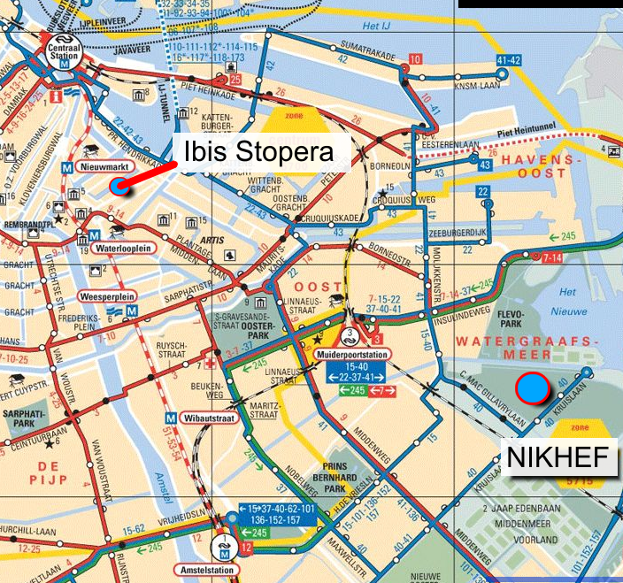 DinnersOn Monday and Tuesday we have organised group dinners (no-host) in restaurants in the city centre, within walking distance from the Hotel Ibis Stopera, or by a short metro ride. On both days, the dinner starts at 20.00 at the restaurant, so leave the hotel at 19.15 on Monday and 19.30 on Tuesday. Buffet lunches (hosted) will be provided close ot the meeting venue at Nikhef, in the "Spectrum" room.
